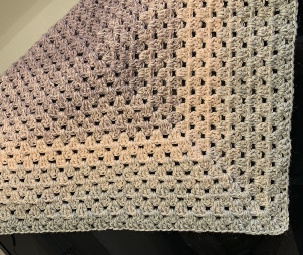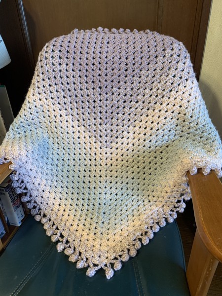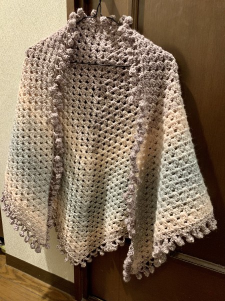 ほぼひと玉分編めました。底辺110㎝、高さ55㎝。きれいな直角二等辺三角形です。私の記憶の中にある昔使っていた三角ショールにかなり近づいていて嬉しい。。もう少し大きくしたいので、もうひと玉は外側から糸を使ってグラデーションを戻って行きます!グレーの範囲が多くなりすぎちゃうかな…。。