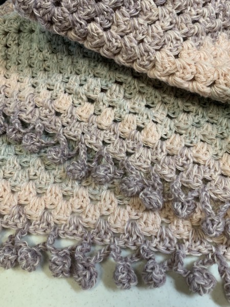縁編みに入りました。パプコーン編みで小さいポンポンを作って鎖で繋いでいきます。