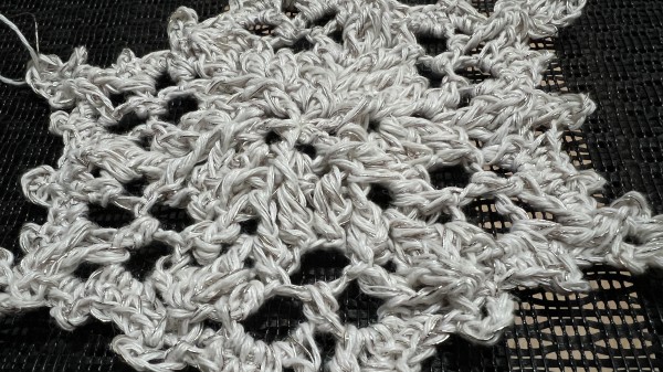 シルバーの極細糸を合わせて編んだ雪の結晶もちーふです。お友達のツリーに飾ってもらう予定です。