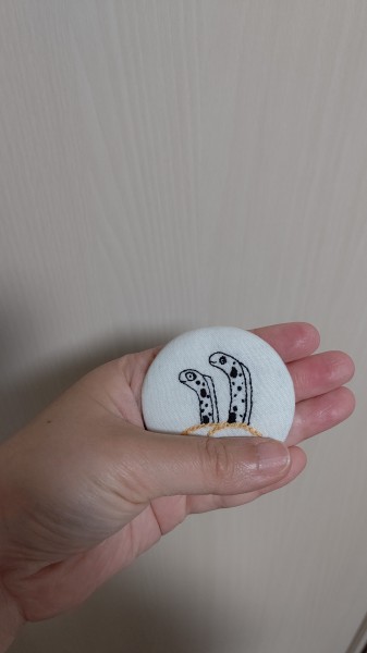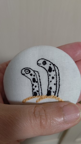 | 缶バッチ製作キットを使用して、刺繍入りの缶バッチを製作しました。 チンアナゴ好きの友達へのプレゼントです (隠している所に、アルファベットで名前が入っています) 1日1~2時間、他作品と同時進行で作業しました。 |