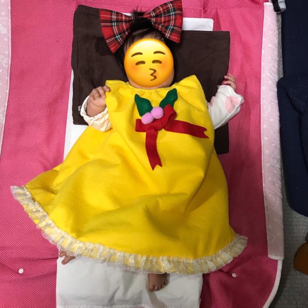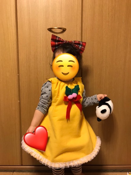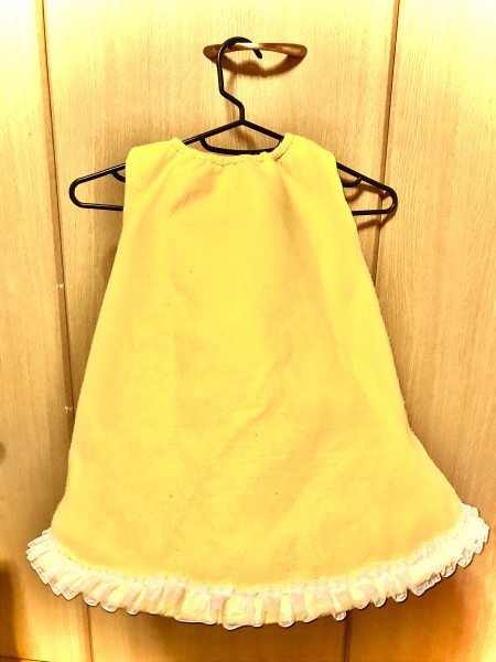 12月だしクリスマスらしいコスプレさせたいなあ、と思い、フェルトでベルに変身させられる服として作りました。胸元に縫い付けてある柊の葉がなかなかきれいにできず、苦労しました。