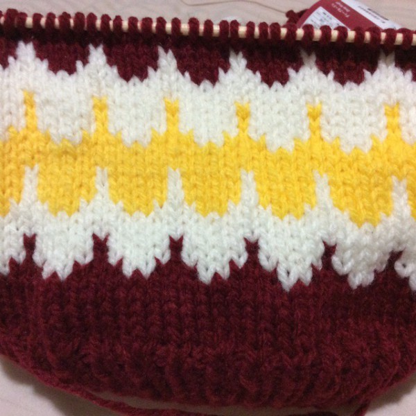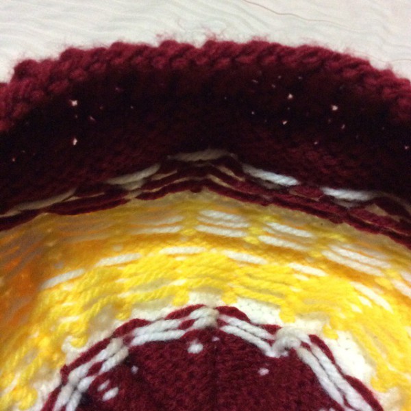 白と黄色で編み込み模様をつくって、はじめと同じ色で頭頂部まで。