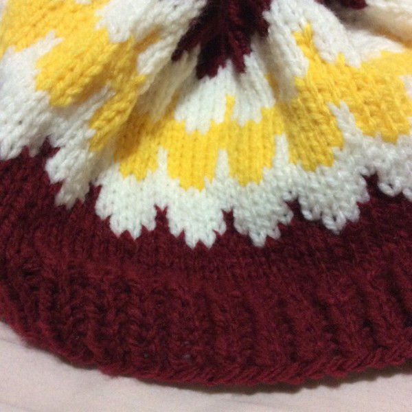 | ギザギザ模様のニットキャップ、第2弾。 今度はちゃんと自分でかぶれるように、太めの糸で大きめに作りましたが、 頭頂部にさしかかったところで糸が足りないかも!?と心配になって焦って閉じたら、浅くなってしまいました…… |