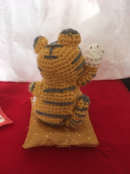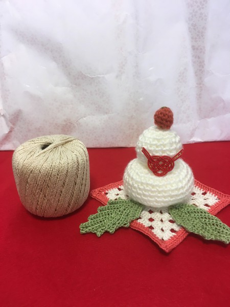 | お正月飾りの編みぐるみです トラは中細毛糸2本どり7号針で編みました 模様は刺繍していますが、背中側がどうなっているのかよく分からなかったので微妙です 鏡餅は本体と橙は毛糸、和紙と裏白は20番レース糸で再現してみました 小さな水引飾りも付けたので可愛くできました |
