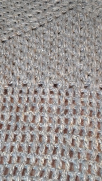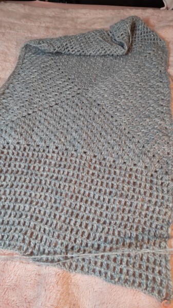 縦60センチ位、横110センチくらいなったので、これから袖をまつって、袖と裾を引き上げ編みで、前たてをすじ編みで編んでいこうと思っています。