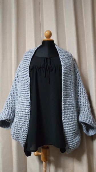 | ふわふわモモンガカーディガン 裾を2ウェイにして、前たてををすじ編みでと思ったのですか、思ったシルエットにならず、ほどいて引き上げ編みでぐるりと編むことにしました。 前たてを幅広くしたかったのですが、途中で毛糸が足りなくなり、ハシゴをして探すことに… ミュゼがなかなか見つからず、結局7件まわることになりました。 でもそのおかげで満足行く出来になりました。 背中は暖かくしたいので、スパイクグラニーにして、袖部分はあまり重たくしたくないので、方眼編みにしました。 袖は長いと邪魔なので、七分袖になるようにしました。 袖と前たては広がらないように、針を7号に変えて編んでいます。 フワフワで軽くて、暖かくて、もう手放せません。 |