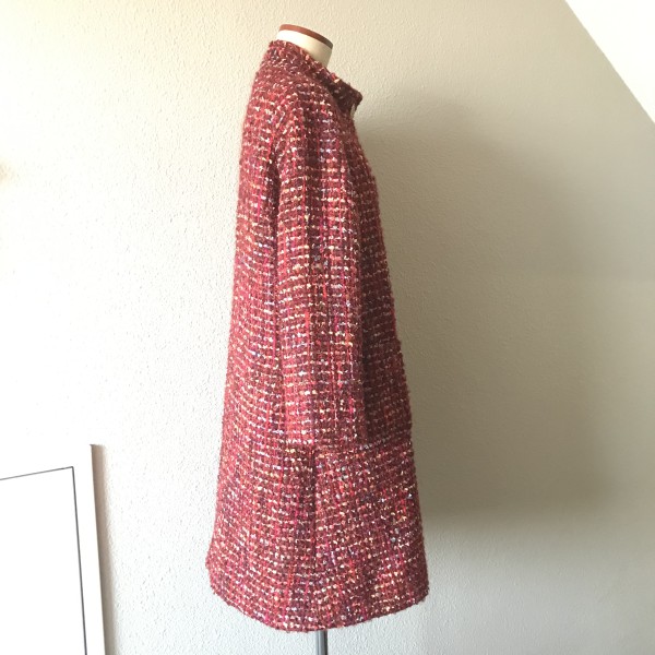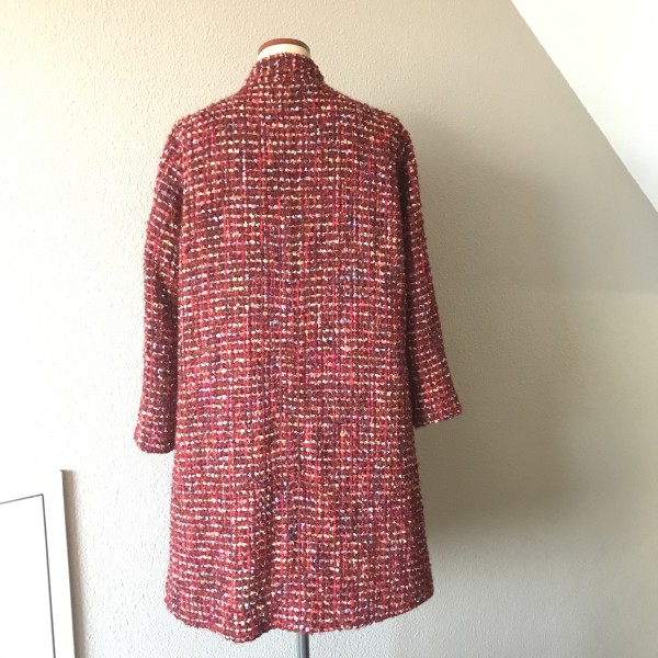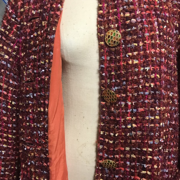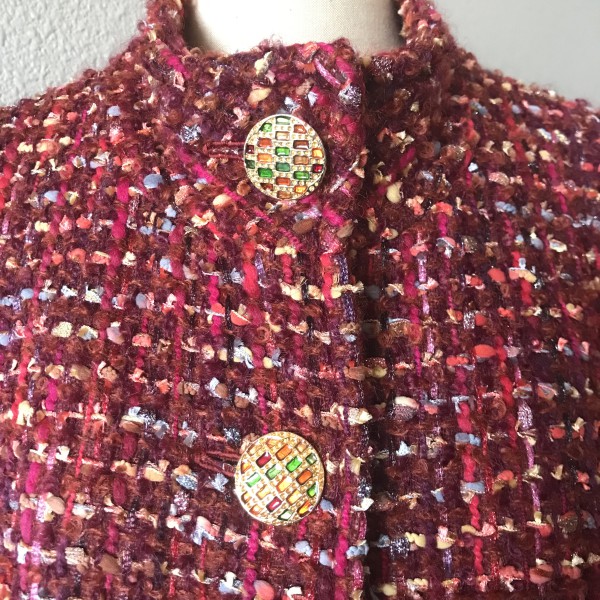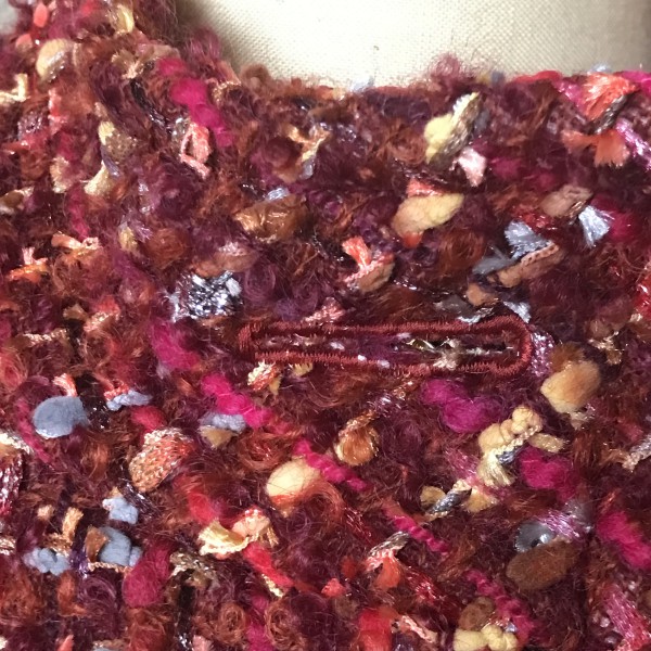 ファンシーツイードはほつれやすいので、手かがりのボタンホールも好きですが、業務用刺繍ミシンで。