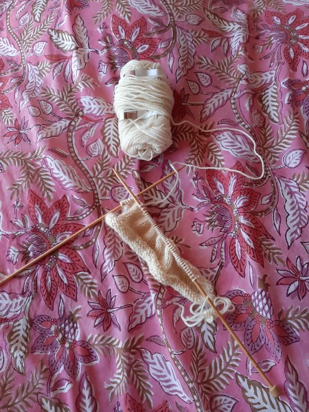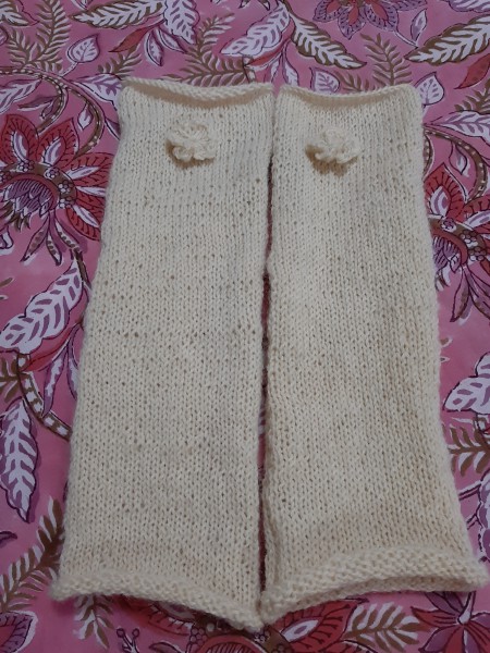 お花のモチーフ編みがポイントです。きものや袖が七歩丈のものを着た時に重宝します。