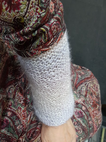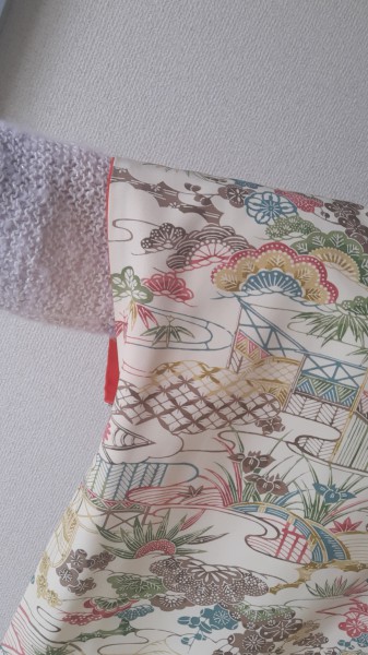 間違えてガーター編みで仕上げてしまいました。でもグラデーションにあっているかな。きものにもお洋服にも合います。