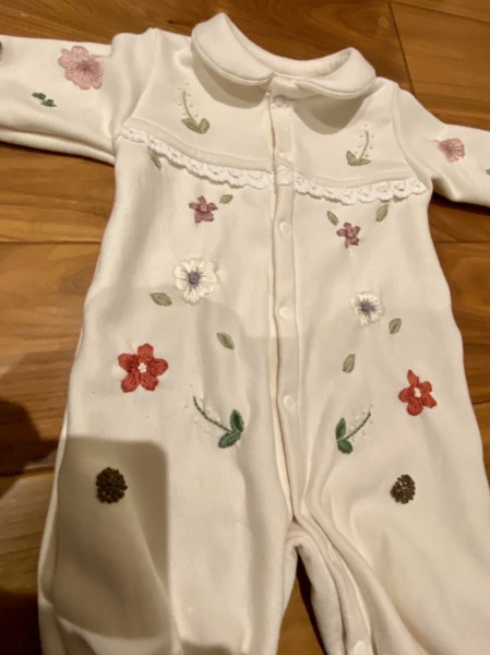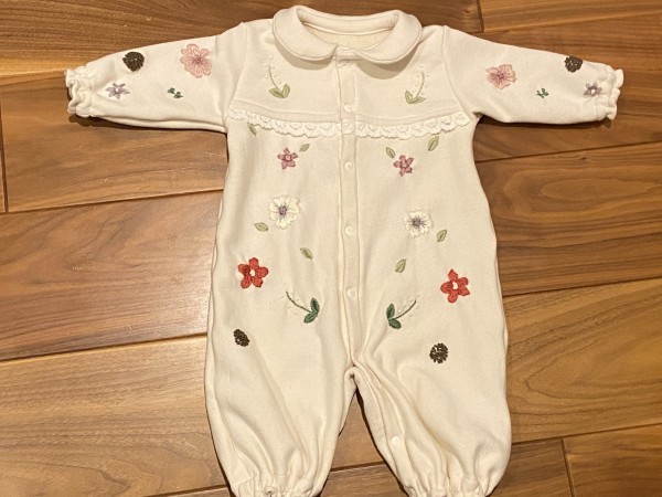 ベビーの2wayオールとヘアバンド、お花の刺繍をして仕上げました。、