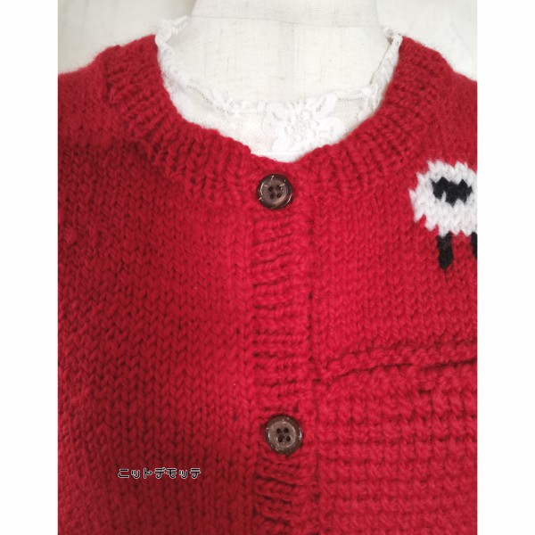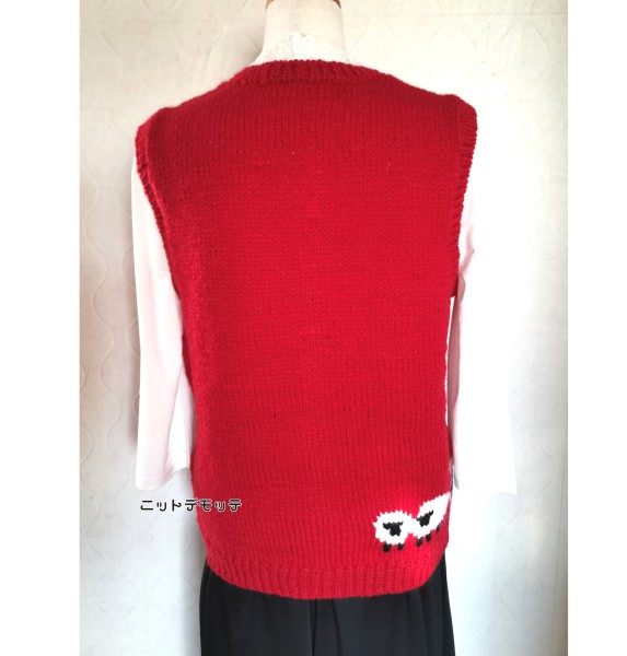 | 無事に還暦を迎えられた記念に初心に返るという意味も込めて自分で紡いだ糸でオリジナルデザインの赤のベストを編みました。 羊さんの編み込み模様も気に入っています。 |