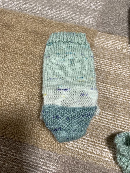 踵部分を編んでから休めてた甲を編むのでそうなってしまうと、後で気がつく。