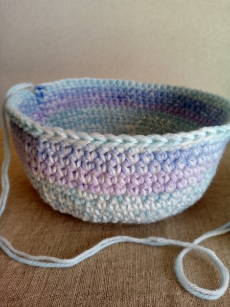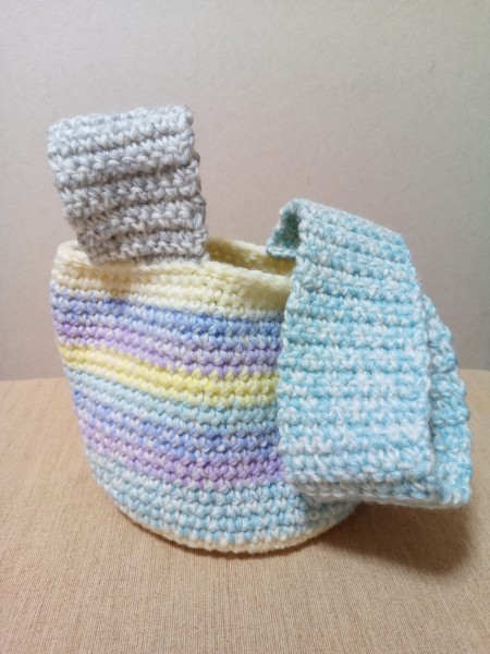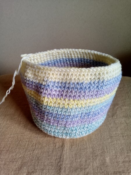 本体が編めました。一作目よりも小ぶりになったので、違う取手を付けようと思っています。