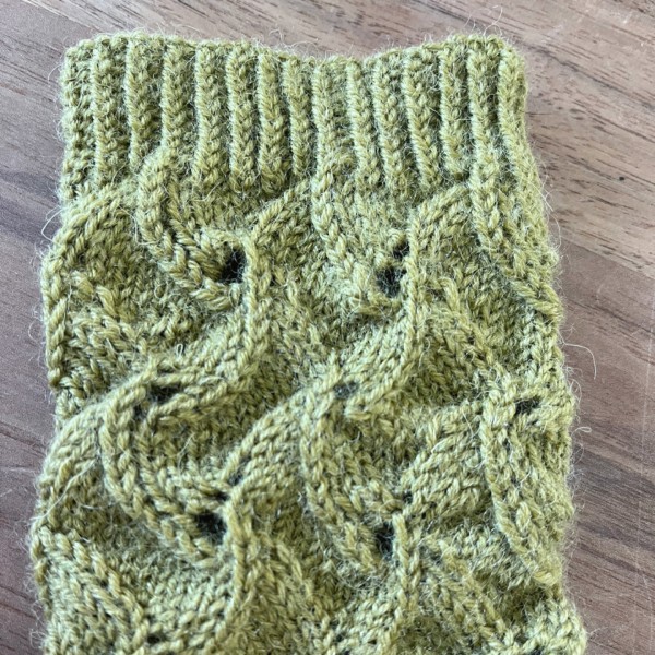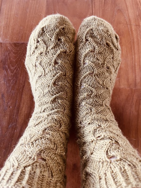 ウェーブ透かし模様のくつ下。6足目のくつ下。合間に小物を色々編んでいたら編み始めてから出来上がるまで1ヶ月くらいかかってしまいました。