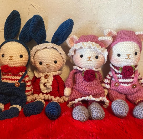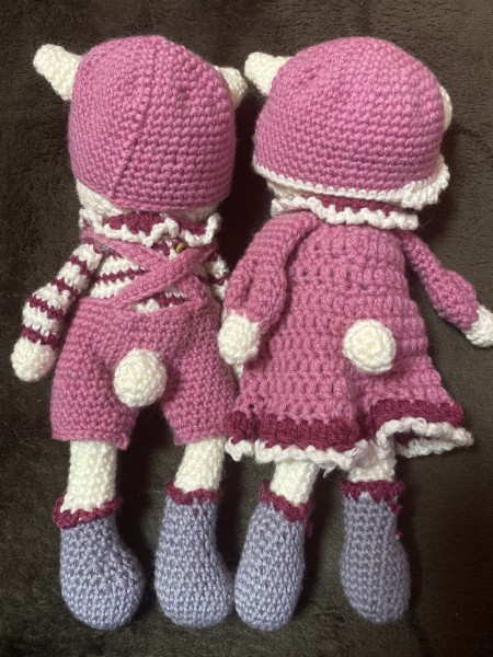 30センチくらいのペアのあみぐるみです。ひとつひとつ顔が変わるのを楽しんでしんます。