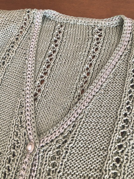 ちょっとおしゃれな感じで、季節の変わり目に使えるカーディガンを機械編みで作りました。