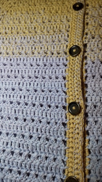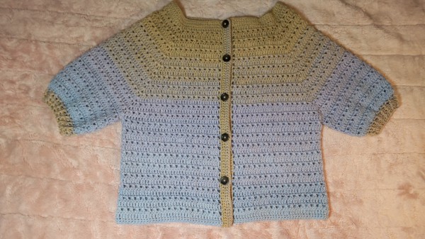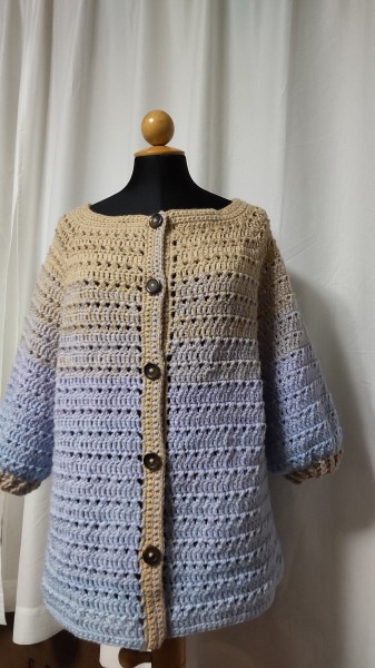 | ワンダーウールでカーディガン もう春ですが、袖を短めにしたのと、今日は1日雪でしたのでもう少し活躍できるかもです。 長編み、交差編みで、軽い感じにしました。 身頃は2玉の色を合わせて編んでいき、袖は1玉から半分になるようコントロールして、グラデーションが自然になるようにしました。 |