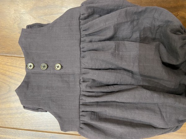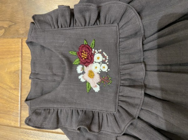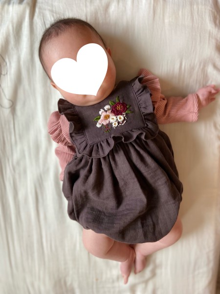 「小さな子どもの褒められ服」掲載パターンのロンパースです。胸元にお花の刺繍を施しました。