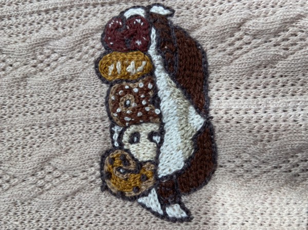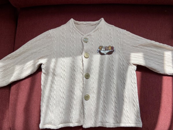 アランニット風生地でカーディガン。パンの刺繍をしています。