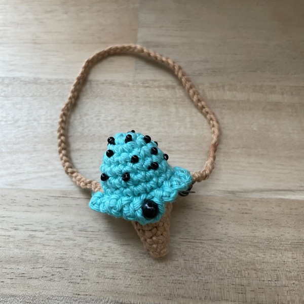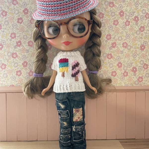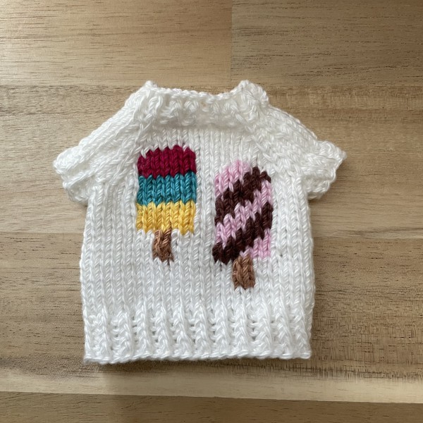 アイスキャンディーを編み込んだセーターとアイスコーンのポシェットを合わせて、夏にぴったりの一枚に仕上げました❣️