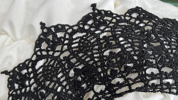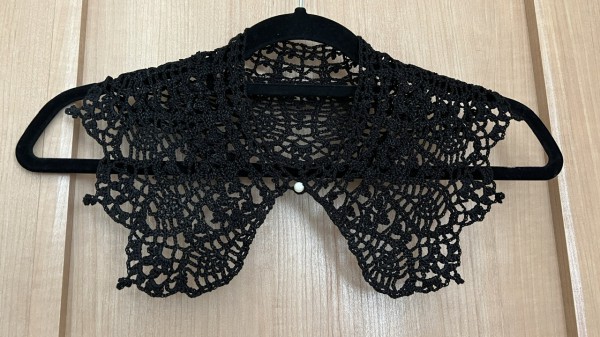 1週間くらいかけてぼちぼち編みました。初めての付け襟です!見本の作り目があまりにも多かったので、半分くらいにしようと思ったら、意外に計算が難しくて頭がおかしくなりました。