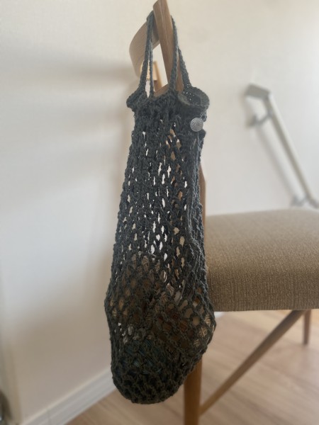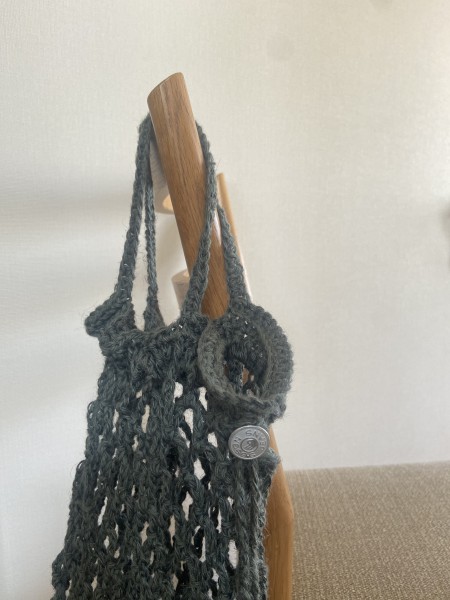 Seeknitの編み物案内に載っていたネットバッグをセリアのジュート糸で編みました。ボタンは昔履いていたジーンズのを使用しました。雰囲気がよくなりました。