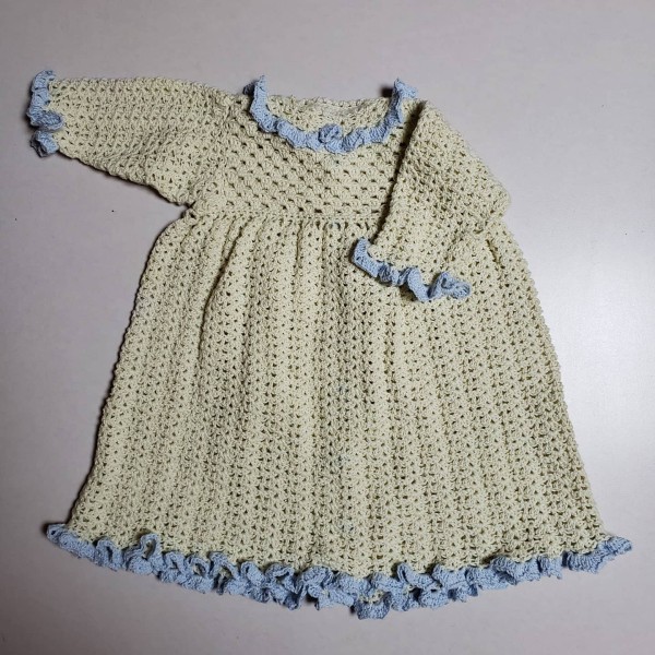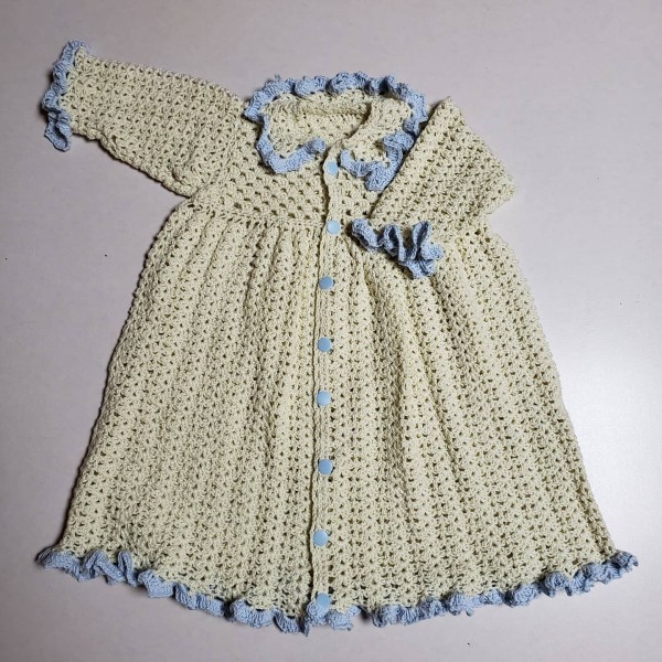 初めてベビードレスを編みました。本体の生成り色の部分は本のとおりに編みました。襟、袖、裾はオリジナルで編みたしました。
