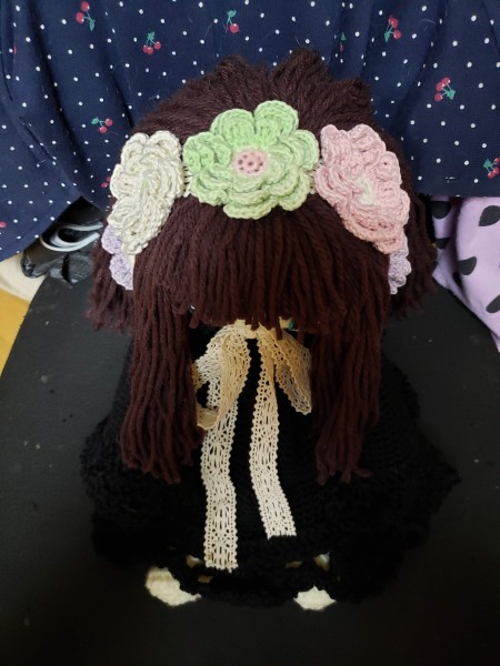 初めてお人形を編んだ過去の作品です。アクリル毛糸で編みました。目と花飾りはコットン糸で5号で編みました。髪の毛は毛糸を切りっぱなしです。