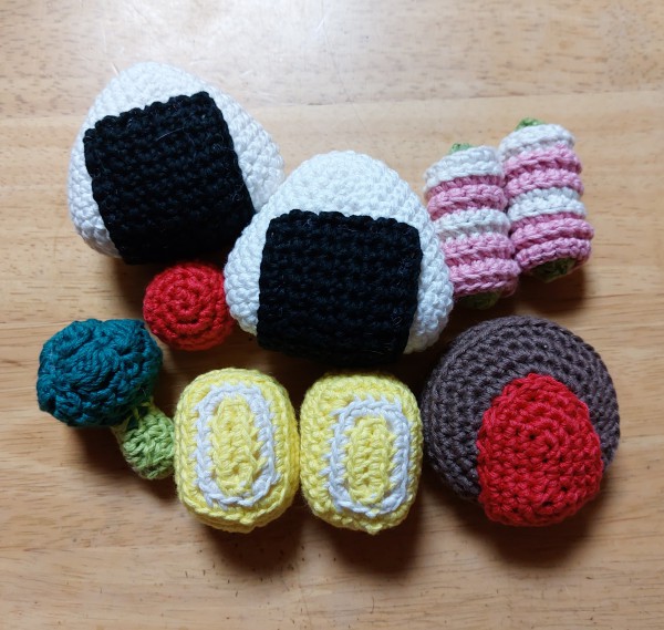 遠足のお弁当をなるべくリアルに再現したくて編みました。なるべくオリジナルで編めるように考えてみました。