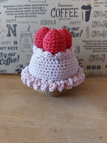 ぽってりとかわいい形になるように編みました。フルーツとクリームの色のバランスが悪くならないようにしました。針山に使えそうです。