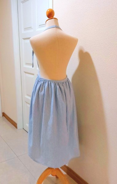 | 友人へのプレゼント用エプロンドレスの試作。 このボディのようにスリムならふんわり広がってカワイイデザインですが、ウエスト周りがギャザーで強調されるためもう少しギャザーを減らしてスッキリするように改良が必要 YouTube 「ミニマルchanの暮らし_元デザイナーのsewing channel」参考 動画では極薄生地を使用していた為、生地によっても雰囲気が変わることを実感 |