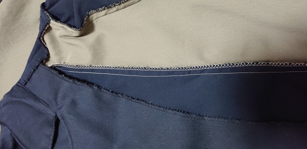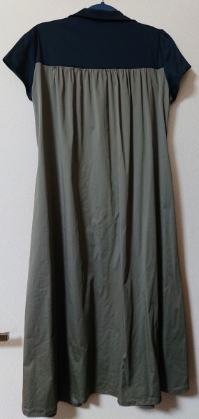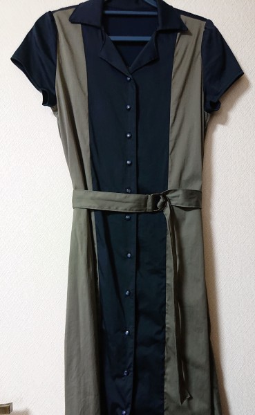 バイカラーのワンピースです。同じ生地(弱いストレッチのワッシャー生地)の色違いを使っています。ベルトも共布です。バイカラーなので縫う場所によって糸の色を変えているので、裏から見ると糸が目立ってしまうけれど問題ありません。