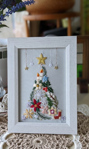 まいたけ 2年 ありがとうございます( ´◡‿ゝ◡`) クリスマスツリーといえば、近年はオシャレで洗練されたものが主流ですが、私はやはり昭和のカラフルな豆電球的な電飾のツリーの雰囲気がノスタルジックで好きです。 刺繍だとツリーも思うままデザインできます(^^)