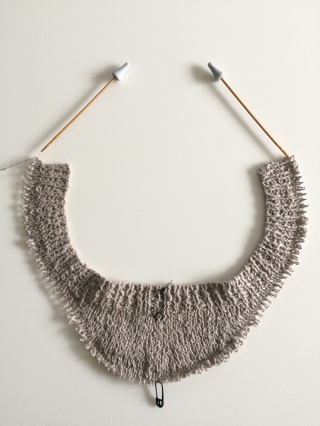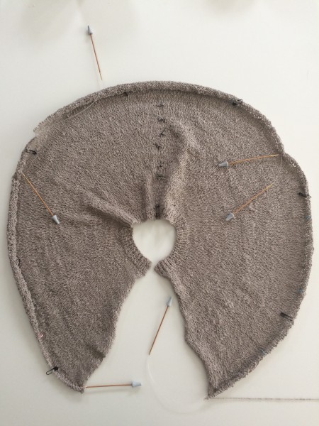このあとは丸ヨークを編んで肩・脇まで増し目しながら丈を伸ばして行きます。