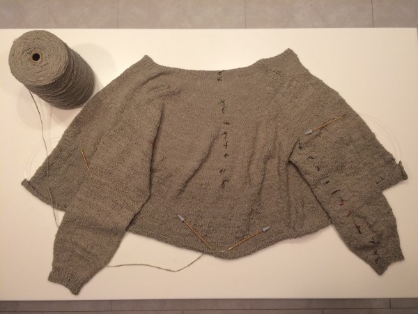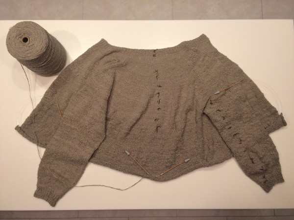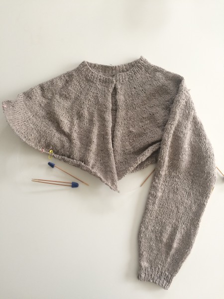 もう片方の袖を編み終えて、脇下から裾までの丈部分を編んでいる最中です。