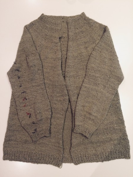 ガラ紡綿糸で編むバルーン袖ロングカーディガンの片腕を編み終えたので、次はもう片方です。