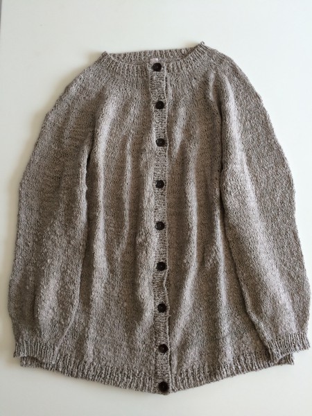 春夏に向けたガラ紡綿糸のロングカーディガンなのですが、ボタンは茶色にしてみました。