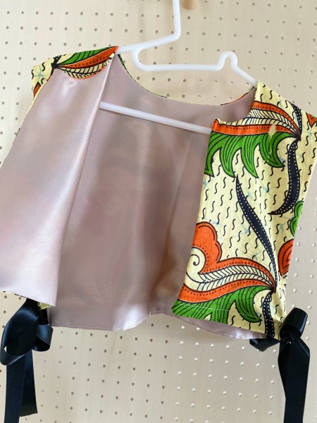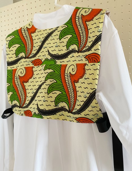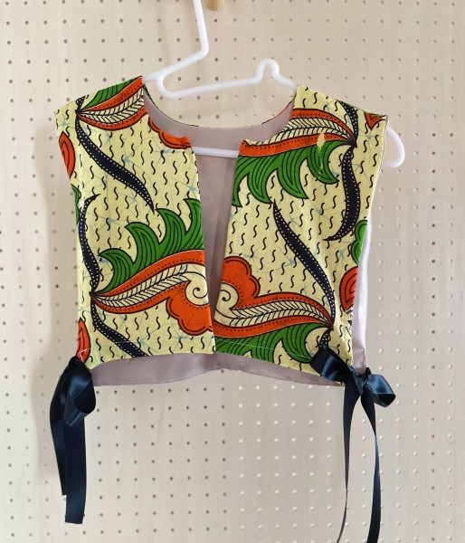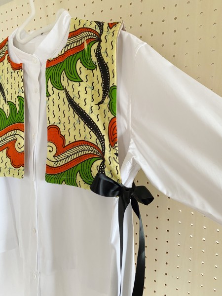 | ヴィンテージのファブリックで作った付け襟です。 アフリカンバティックのワンピースを丈上げした際に切った部分を再利用しました。 一枚だとペラペラしてしまうので裏地をつけました。 サイドはリボンで結べるようにしています。 無地のシャツやロンTなどシンプルな服に合わせるだけでいつもとは違った雰囲気になります。 |