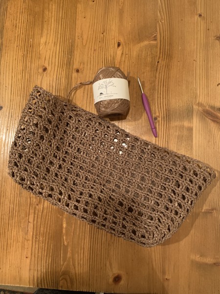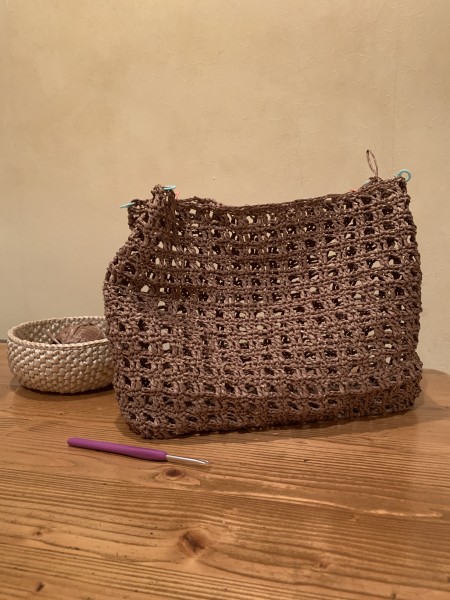 以前に編んだブルーのバッグが小さかったので大きめのサイズにして作りました。