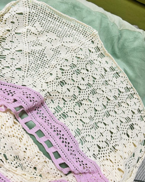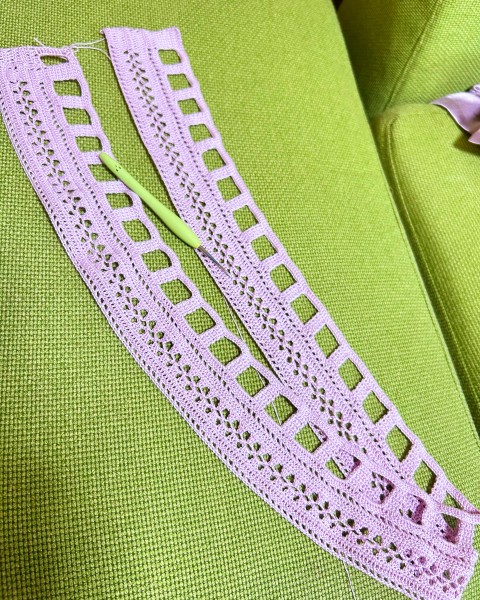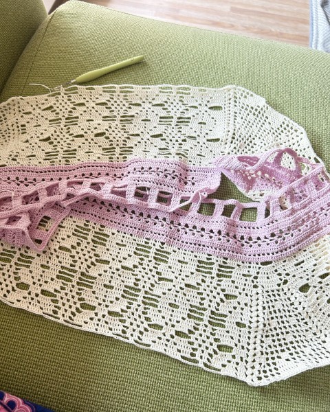 ひと玉終わって新しい玉に入りました目指す長さにはまだまだ先です。方眼編み部分の模様がいい感じに出てくることを楽しみに続けていきます。
