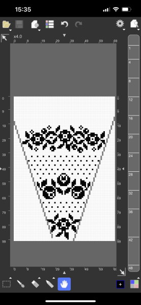 フレアにする為に三角の方眼編み用の模様も並行して製作。最初の花エリアまでは海外の傘用のレースパターンから。