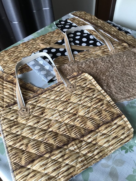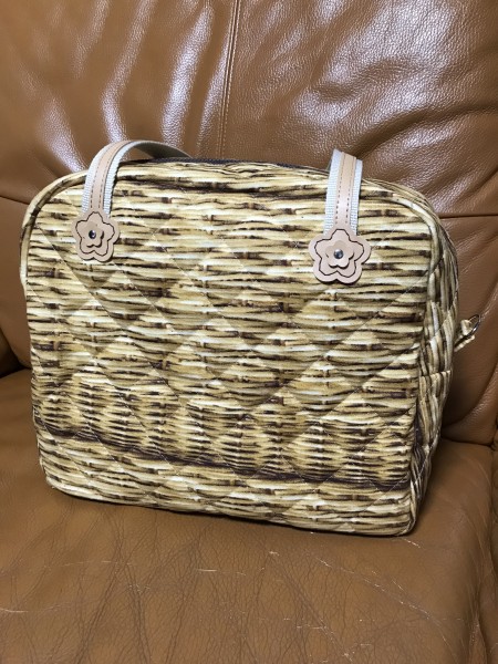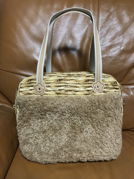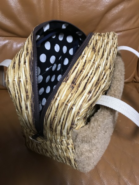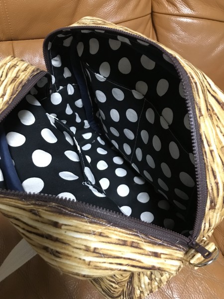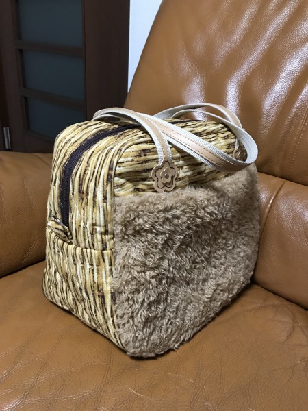 秋冬へむけて、モフモフ、キルティング生地にチャレンジ。内側にもポケットをつけて、水玉柄で可愛くできました。