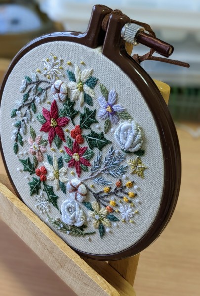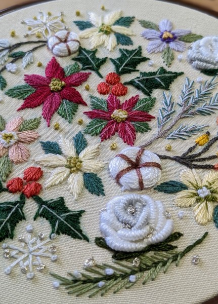 クリスマスの花々や雪の結晶などを盛りだくさんに刺繍しました。銀のラメ糸が薔薇の花と結晶を上品に輝かせています。