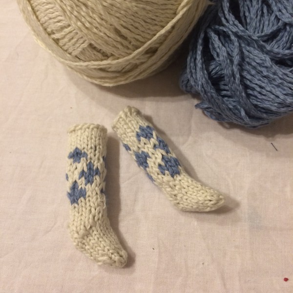 1/6ドールの洋服ひと揃えを綿糸縛りで作りたいとのですが、靴・靴下をどうしようかと考えて、ルームソックスな仕上がりにして見ようと模索中。