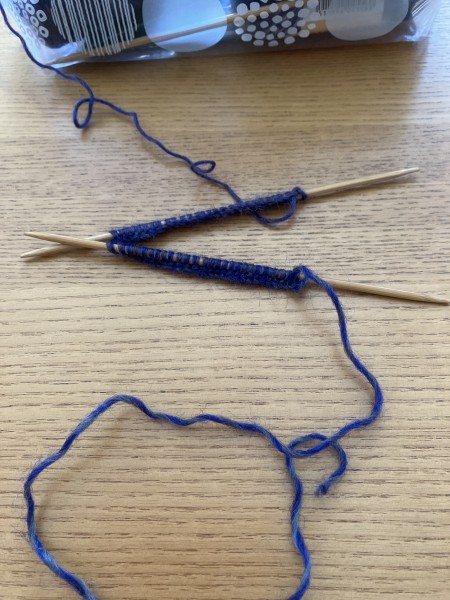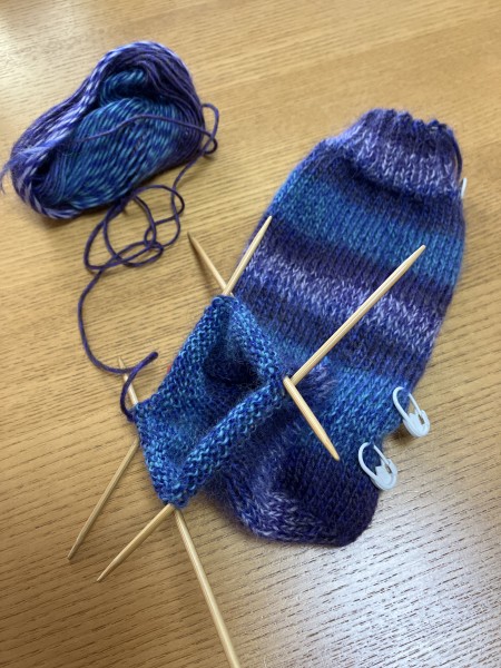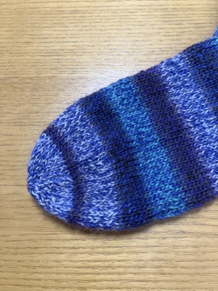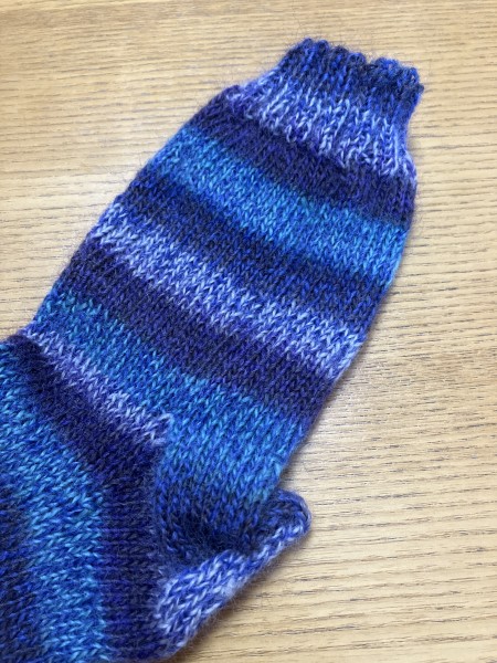 ぴったりサイズで編んでいたのですが、ソックヤーンじゃないから洗うと縮むことに気付き、目数を増やして(48目→56目)編み直すことにしました。