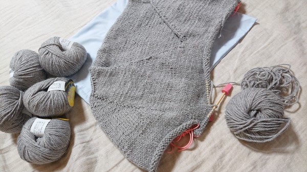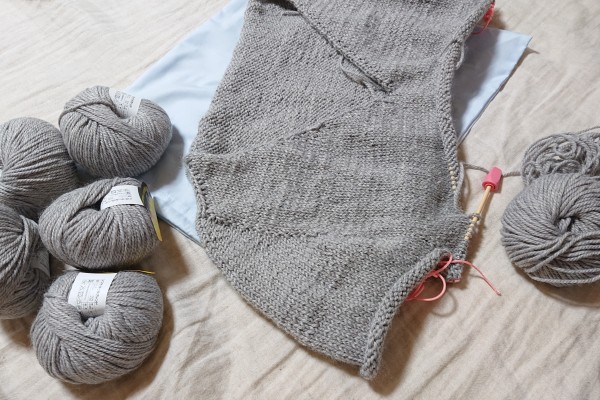 年末忙しくしており進んでいませんでした!現在はこのような状態。腋下は別糸の作り目で裏目を捨い、身頃をつなげて輪に編んでいます。ゆるやかなAラインにするため10目ごとに左右に2目づつ増やし目をする事に。ここから先は袖と身頃をひたすら長くするだけですが、丈や袖の長さなどデザインの方向性を決めないといけません..。