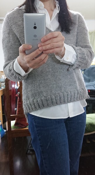 袖、前身頃も編み上がり、残るは後ろ身頃のみです。参考編み図(『Top-Down Sweaters セットインスリーブみたいなトップダウンのセーター』日本ヴォーグ社)のインストラクションも袖丈と身頃は、好みでとの記載、自由に編んでみました。