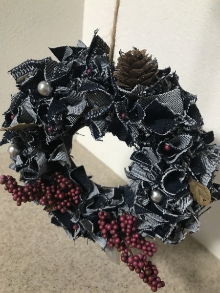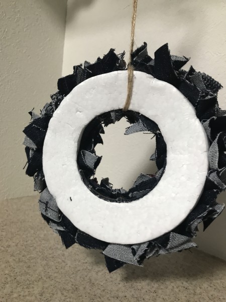 デニムのハギレを発泡スチロールのリース土台に刺して製作。