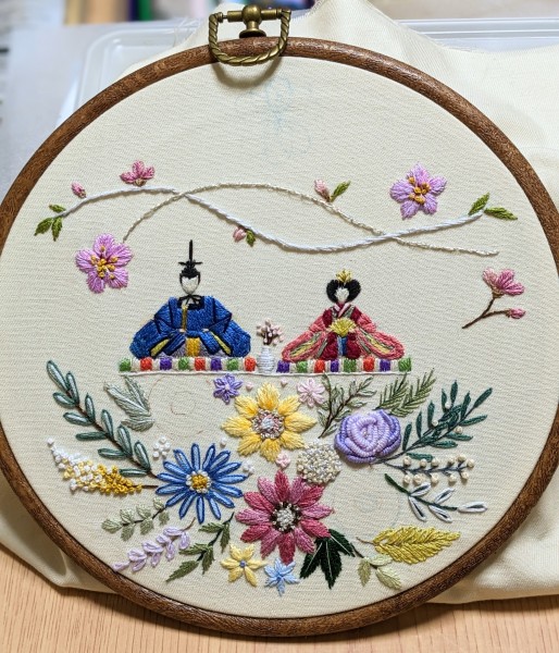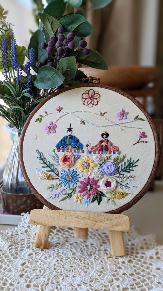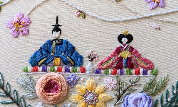以前作ったお雛様の図案を土台に、お雛様の衣装や、背景などを変えて、新しいお雛様刺繍フレームを作りました。