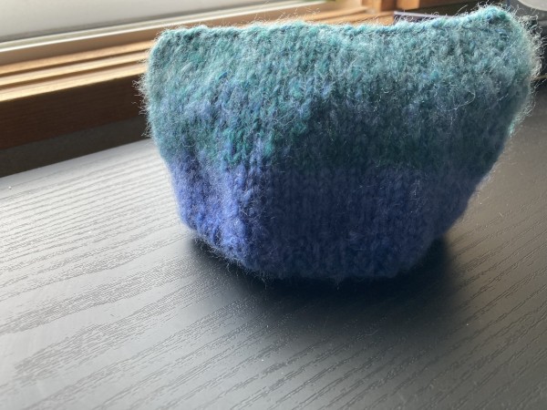 苦労したのはモヘヤ系の段染め糸を2本どりでソレなりに色を揃えてから編み始めたのですが、やはり途中からは色が違いました。
